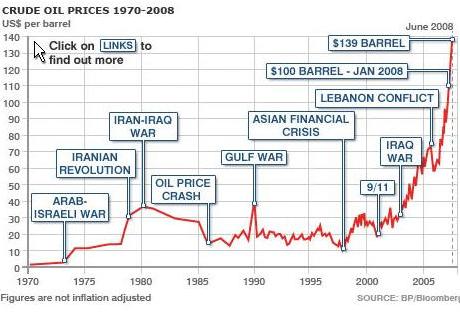 1980年ごろから、20〜30ドル程の相場だったグラフが、2003年のイラク戦争の頃からうなぎ上りとなっています。グラフを見ると1年前の2倍、5年前の5倍近くという急騰ぶりです。