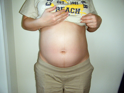 来月はグルコーステストがあるらしく、超音波検査もあるから、(糞甘いオレンジ味の炭酸の抜けたジュースと医者は言ってた)を朝飲んで、検査に行くらしい。それにしても、写真でもわかるとおり、かなりお腹が大きくなってきました。今の所、妊娠線はでてないけど、正中線ができた。なんかお腹が真ん中で別れてるみたいで変な感じ。ほんと、まるまるー♪