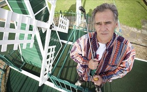 クレイジー・ゴルフは18ホールでパー36。写真のデイビスさんの隣に写っている風車もコースの一部。なんと回る風車の羽がコースを妨害していて、タイミ ングよく通さないと跳ね返されてしまうんですね。他にもものすごく細いところを通さないと行けない場所や波打つ芝生など、難解なコースが目白押しなので す。トッププレーヤーは10アンダーからパーぐらいで回るということで、この辺の感覚もゴルフと一緒。