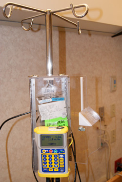 でもって、11時頃に促進剤を初めて1時間半、今迄も痛かったけど、まだ余裕があったのに、痛みがかなりきつくなって、硬膜外麻酔をする事に。エピちゃん早く来て!と・・麻酔科の先生が来て、ベットの上で枕抱えて丸くなって、腰椎にぶすっと?さされる感じ。ちょっとすると、下半身が麻痺した感じになって、痛みがまったくなくなって、それからしばらくは快適ライフ。小説読んだり、少し仮眠を・・と思いつつ部屋を暗くしてもらって旦那はソファーで、私も目をつぶってみたけど、しょっちゅう看護士さんが出たり入ったり&モニターとかのおかげであまり寝れなかった。