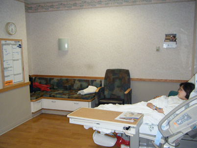 折り返しの電話で病院に来るようにとの事で5時半に旦那と一緒に病院へ。それからが長〜い戦いだった。まず最初のトラブル・・病院に着くと、かかりつけの医者の名前を聞かれ、答えたものの、それが何が間違えたのか、他の産院の先生の患者と間違われて、部屋に着くと、あなたのOBGはドクタースワニーです。といわれ、へ?誰それ?と思いつつも、何故か病院側がやけに自信ありげなので、よくわからないまま、その初めて会う男の先生(でも良い先生だった)にお世話になる事に。笑)とりあえず陣痛は来ているものの、子宮口はまだ3cm3時間ほど様子見してもあまり変わらないので、午前9時にお医者さんが来て、羊水を破裂させたんだけど、それから3時間たってもせいぜい4cmだったので結局陣痛促進剤を使う事に。
