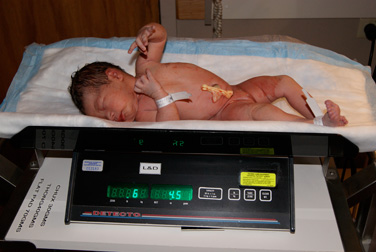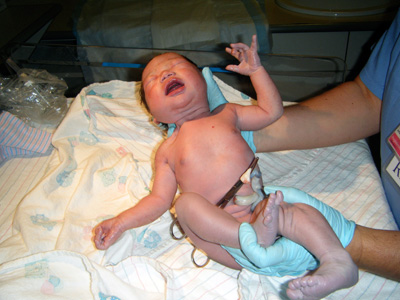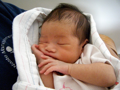 あー、誰かが鼻からスイカがって言ってたのがわかる・・などと頭の片隅で思いながら頑張って息む。頭が半分でかけたぐらいに医者が戻ってきて、最後の押し出しを頑張る。たぶん、本当は会陰切開するんなら、その前に切るべきだったんだろうけど、医者が戻ってきた時には頭が半分出てきてたのでたぶん間に合わなかったんだろう。それで、中が裂けちゃったんだな。結局娘がでてきたのは息み始めて2時間後、11時2分に生まれた。陣痛が始まってから、約21時間経っていた。無事に娘が生まれたものの、普通の人より結構出血が多かったらしく、生まれた後のリペア、縫うのにも結構時間がかかっていた。