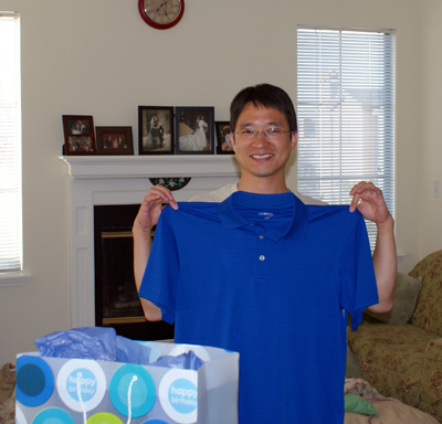で、もひとつは、うちの両親からもらった誕生日プレゼント。すっごい喜んでました。青が好きな色なので、青のゴルフシャツと半ジーンズ。