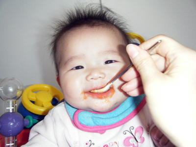 初めての離乳食におつきあいしてくれた友人達も吃驚の食いつきぶり!今回の写真はオーガニックのキャロットですが、とりあえず、おかゆ/ライスシリアル、プルーンなどを試したところどれもオッケーで一口ずつ試すはずがもっと食べさせろと最初から超びっくりな食いつきぶり。