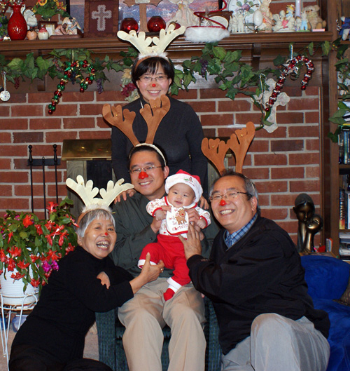 早いもので、もう12月。家に帰ったらクリスマスの準備をしなくてはいけません。へちゃみさんのファーストクリスマスだしね。今年の家族写真はちょっと面白いものになりました。へちゃみさんがサンタさんで、あと4人は赤鼻のトナカイになって写真撮影。後で、インターネット用のものも作るのでそれはこちらにも掲載するかな。