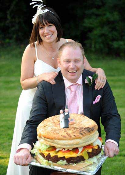 消防士のTomは大のファストフード好き。このたびイギリス東部のNorwichにあるZak's American diner食堂でKerry嬢との結婚披露宴を行った。そのハイライトシーンに登場したのが、彼が大好きなチーズバーガーで作られた巨大なウェデングケー キ(というよりウェディングバーガー)。