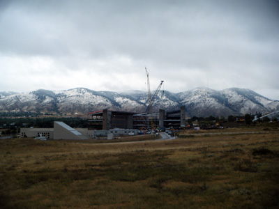 昨日はまた、ママのリクエストでエコーレイクとエバンズ行ったけど、頂上まではいけませんでした。それにしても今日は結構寒いな〜って思ってたら、目の前の山に雪が・・・。昨日は標高の高い山だったから吹雪にあってもあんまり驚かなかったけど、今日は今の気温で、1度。寒いので雨が雪になったのでしょう。ちなみに今コンストラクションしているのは、旦那の務めているとこ。新しいでっかいビルたててます。その向こうの山が白くなってるのが分かるでしょうか?