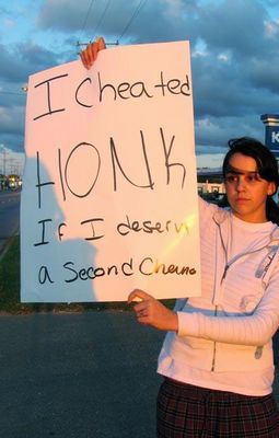 取材に対して、彼女はこの1時間半の間に通りがかった車から57回クラクションを鳴らされたと答えています。また、わざわざ車から降りてきてハグした り、「グッド・ラック」と声をかけてくれる人もいたそうです。今年の夏の始めに浮気をしたのがばれたジェスさんは付き合っていたフィアンセの彼に婚約を破棄されてしまいました。彼のことがどうしてもあきらめきれないジェスさんは、交際1周年の記念日に罪滅ぼしのつもりでこの行動に出たのでした。以下、彼女 のコメントです。