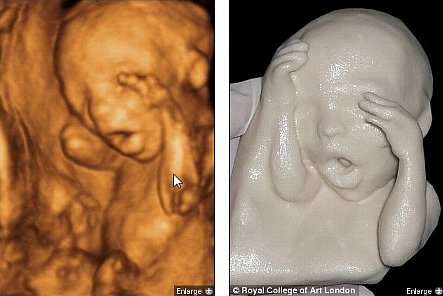 この技術は、お母さんのお腹の中にいる赤ちゃんをそのままの姿で等身大の立体像にする技術で、モニタ上で3D映像として見るだけでなくて実際に3Dプリンターを使って立体像にするという優れものらしいです。技術を開発したのはイギリスのロイヤルカレッジオブアート(RCA、王立芸術学院)で博士号を取得しているブラジルの学生Jorge Lopes博士で、超音波とMRIを使って子宮の中の赤ちゃんのデータを取得して、それを元にプラスチックの粉を使って徐々に立体像を作っていく3Dプリ ンターを使って等身大の赤ちゃんの像を作ることが出来るそうです。