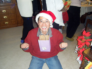 この間丁度電話で、クリスマス会があるよって聞いてたんだけど、すっかり教会で、クリスマス礼拝の事かと思ってたら、その中の一人のおばあちゃん宅でのクリスマス会で、おいしいごちそうをいっぱい食べさせてもらいました。さすがみんな料理年期が入ってておいしいのよ、これが!趣旨を理解してなかったから、手ぶらでお邪魔下にも関わらずいっぱい「おみや」まで頂いてしまって・・・ありがとうございました〜♪ 、もいっこの写真は、プレゼントを貰ってよろこぶうちの「犬」です。笑)