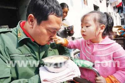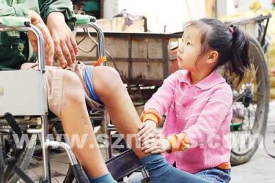 毎日、萃萃ちゃんが帰宅すると、まず、大きなタオルを洗うことから始まる、父親の顔を拭くための大きめのタオル、体が小さい萃萃ちゃんはタオルを絞るだけで3、4分間かかる。その後、足つま先を立てて、父親の顔、首、背中を力いれて拭いた。萃萃ちゃんは今年6歳、小学校1年生、宝安区沙井街道南洞村に住んでいる、5年前に父親の熊春さんが突然の病気に襲われ、首から下が麻痺して動けなくなった。治療のために、蓄えも底をついた。現在、一家の生活は母親のパート収入で維持している。
