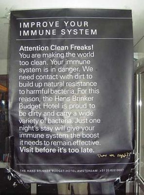以上の理由から、当ハンス・ブリンカー・バジェットホテルは汚れており、かなり多種多種のバクテリアがいることを誇りとしています。たった一泊の滞在でも免疫が高められ、その効果は持続します。ご利用をお待ちしております。