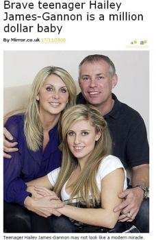 イギリス人の少女・ヘイリー・ジェームス・ガンノンさん(Hailey James-Gannon)は16年前、4か月も早く生まれてしまったため、誕生時の体重はわずか709グラムしかなかった。当時のヘイリーさんはまだ耳がなく、肺や胃も未発達の状態だった。集中治療室に入れられたヘイリーさんには、感染症を防ぐために両親さえ会うことが許されず、彼女に処方される抗生物質などの薬は一日につき1,000ドルかかる日もあった。やがて、ヘイリーさんの生命維持にかかる金額が1.2百万ドルに達すると、「百万ドル・ベビー」として有名になった。幸い、ヘイリーさんの母親が早産になったのは旅行中で、その費用はすべて保険でまかなうことができたという。その後、ヘイリーさんは順調に育ち、4歳の時にはミス・コンテストの最終選考に残る程の美少女に成長。(確かに美人さんですよね~)