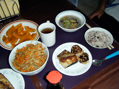 私の場合いつも冷蔵庫の中を見てから大体メニューを考えるんだけど、最近はできるだけ野菜中心のメニューを心がけている。昨日は、写真の通り、五 穀米に野菜の中華スープ、きんぴらに鯖とれんこんの挟み揚げ。今日の夕食はティラピアのフライ、タルタルソース添えに生野菜とオクラと納豆を混ぜたものに ポテトサラダ&昨日のきんぴらの残り。