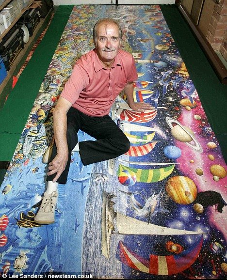 今日はこれってニュースは無かったけど、世界最大のジグソーパズルを完成させたおじいさんがいて、エリックさんっていうんだけど、パズルの全長 は、12フィート(3.6メートル)。ピースの数は、実に2万4000個。要した日数は179日(約6か月)。現在そのパズルは、エリック氏の車庫に飾ら れているとのこと。